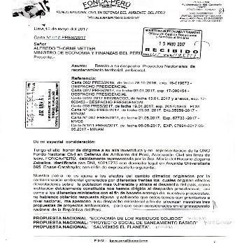 Carabayllo, 15 de mayo del 2017 La ONGD FONCA PERÚ presentó ante el Ministerio de Economía y Finanzas los proyectos de reordenamiento territorial ambiental a fin de que sean considerados en el Presupuesto General de la República “ECONOMÍA DE LOS RESIDUOS SÓLIDOS” que consiste en construir a nivel nacional 202 complejos de tratamiento final e integral de los residuos sólidos” que reemplazarán a los rellenos sanitarios. Proyecto Nacional “SOCIAL SANEAMIENTO BÁSICO” dotar de un desagüe a más de 9 millones de peruanos [...]